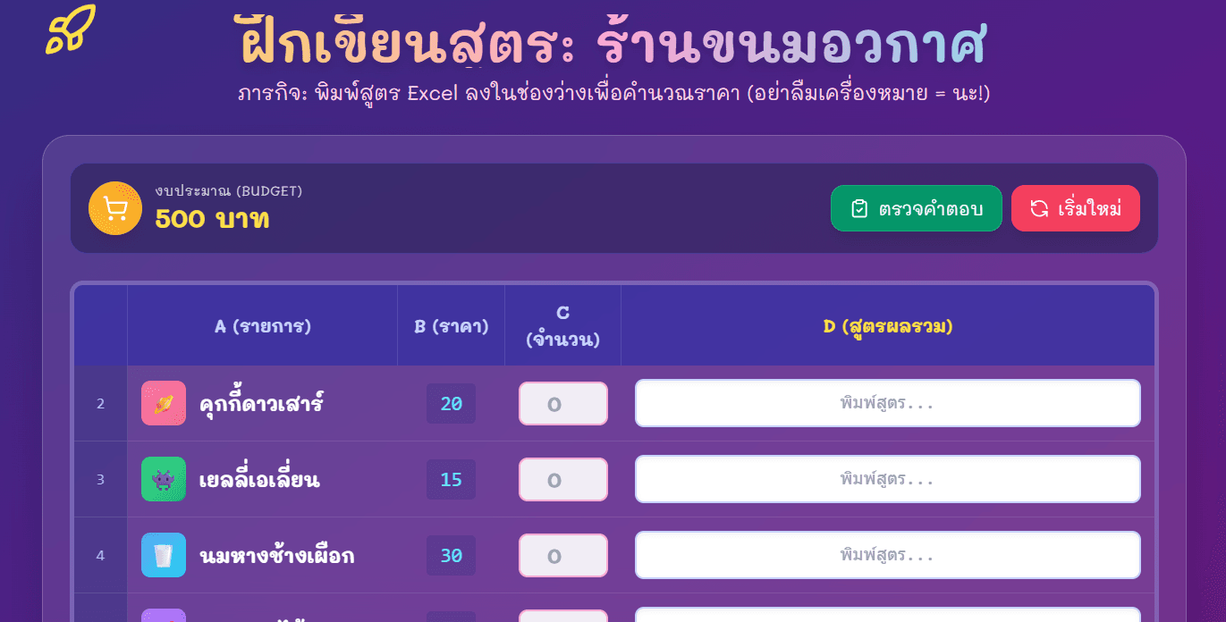 - เป้าหมาย: เราอยากได้อะไร? (เช่น อยากกินขนมที่อร่อยแต่ราคาไม่แพง)