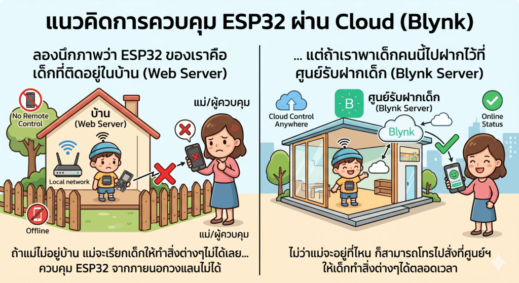 ลองนึกภาพว่า ESP32 ของเราคือ เด็กที่ติดอยู่ในบ้าน (Web Server) ถ้าแม่ไม่อยู่บ้าน แม่จะบอกให้ทำสิ่งต่างๆไม่ได้เลย แต่ถ้าเราพาเด็กคนนี้ไปฝากไว้ที่ศูนย์รับฝากเด็ก (Blynk Server) ไม่ว่าแม่จะอยู่ที่ไหน ก็สามารถโทรไปบอกที่ศูนย์ฯ ให้เด็กทำสิ่งต่างๆได้ตลอดเวลา